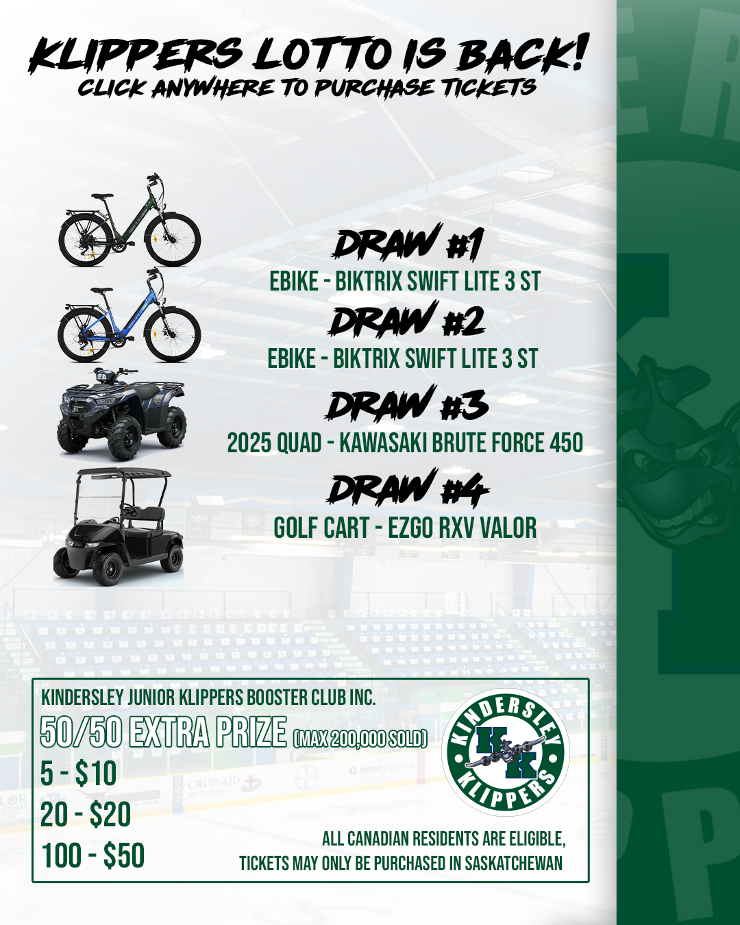 The Kindersley Junior Klippers Booster Club is kicking off 2026 in a BIG way! 🎟️ 4 massive prize chances, including: • 🚗 EZGO RXV Valor Golf Cart • 🏍️ Kawasaki Brute Force 450 Quad • 🚲 2× Biktrix Swift Lite 3 ST E-Bikes PLUS the 50/50 jackpot as an added bonus! Every ticket supports Klippers […]